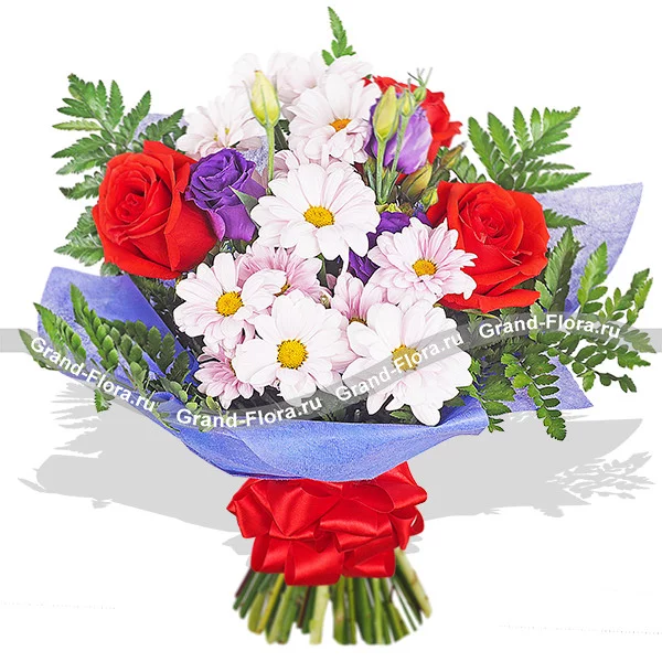 Стандартный (на фото): роза красная - 3 шт., хризантема кустовая  светло фиолетовая - 2 шт., эустома фиолетовая - 2 шт., папоротник - 5 шт., фетр синий, бант красный.