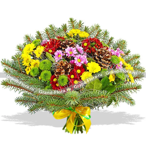 Стандартный (на фото): хризантема желтая ромашковидная - 3 шт., хризантема розовая ромашковидная - 3 шт., хризантема зеленая (сантини) - 3 шт., хризантема красная ромашковидная - 3 шт., еловая ветвь, новогодний декор и зелень, сетка, бант желтый.