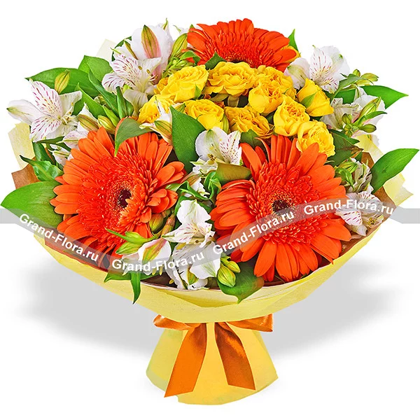 Смешанный выразительный букет из огненно-оранжевых гербер, желтых роз и нежных белых альстромерий великолепно дополнен рускусом. Яркий букет будет отличным дополнением к подарку в день рождения любимой мамы или сестры, а также выражением благодарности дорогой подруге или коллеге